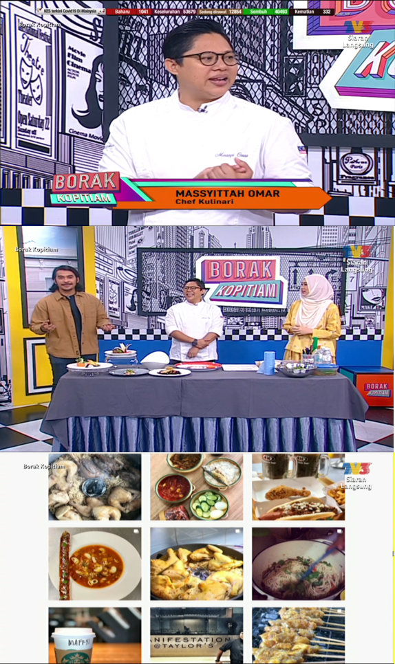 Chef Massyitah Omar from Taylor’s Culinary Institute appeared Live on Borak Kopitiam, TV3 Studio. Borak Kopitiam is a Sunday Morning talk show aired from 8:00 to 9.30am that discusses about a variety of topics hosted by famous local hosts Mr. Hefny Sahad and Ms. Dayah Baker.