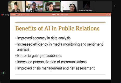 In line with the wide usage of Artificial Intelligence (AI) in our working lives, newly appointed Visiting Professor Kim Fajardo from College of Communication, Polytechnic University of the Philippines was invited to deliver his lecture on “AI and PR” virtually. His “Man vs Machine” case study showed very clearly that AI cannot replace human relationship, a consolation to the students about the sustainability of future jobs in the PR industry.